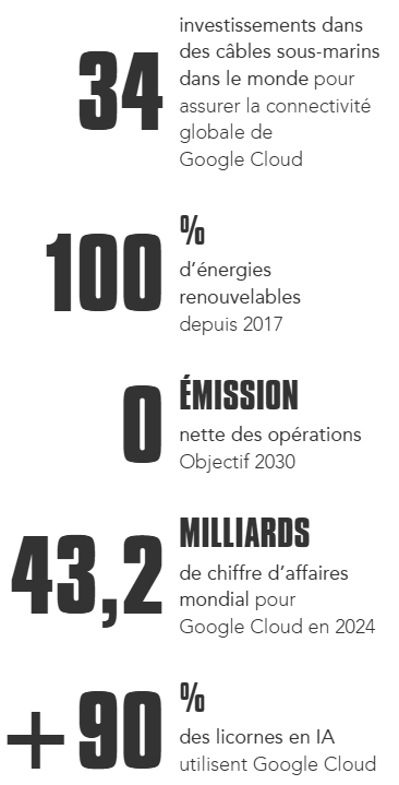 Les questions environnementales sont au cœur de la stratégie de Google et donc de Google Cloud. L’entreprise conçoit ses infrastructures et ses composants dans une logique de sobriété. Résultat : une puissance de calcul multipliée par 6 pour la même consommation énergétique en juste 5 ans. Cela passe par la compensation à 100 % en énergies renouvelables depuis 2017, notamment via des contrats avec des énergéticiens du monde entier et par une innovation continue sur les méthodes de refroidissement des data centers, ou encore l’éco-conception des composants électroniques.
